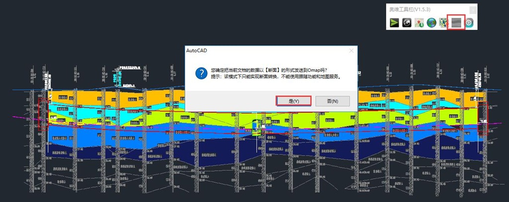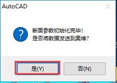 將基線發(fā)送到CAD中后,系統(tǒng)跳轉(zhuǎn)至CAD窗口,彈出提示“斷面初始化完畢,是否將數(shù)據(jù)發(fā)送到奧維”,點擊【是】按鈕,執(zhí)行發(fā)送。