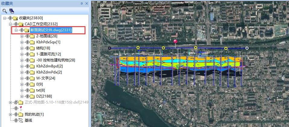 發(fā)送完成后,在奧維互動地圖中,收藏夾會自動創(chuàng)建一個以“CAD工作空間”命名的文件夾,地圖上會顯示發(fā)送過來的斷面圖。