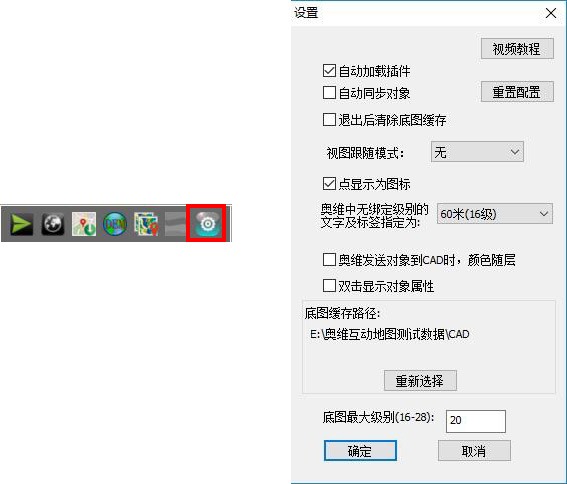 (9)底圖緩存路徑:用于存放CAD加載底圖時緩存的數(shù)據(jù)。插件已設(shè)置好默認路徑,用戶可點擊【重新選擇】按鈕,重新選擇下載的底圖存儲目錄。