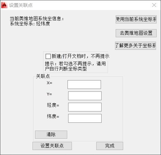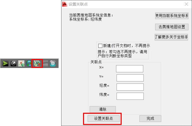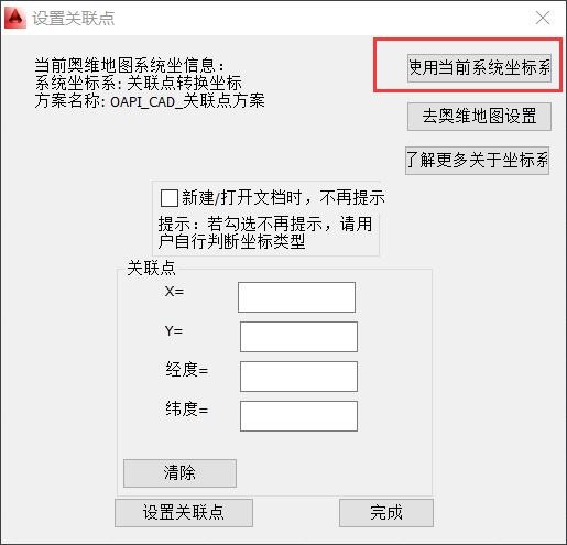 使用OmapCAD插件,首先要設(shè)置坐標系。默認情況下,每次啟動AutoCAD,會自動彈出[設(shè)置關(guān)聯(lián)點]窗口,提示您設(shè)置坐標系。