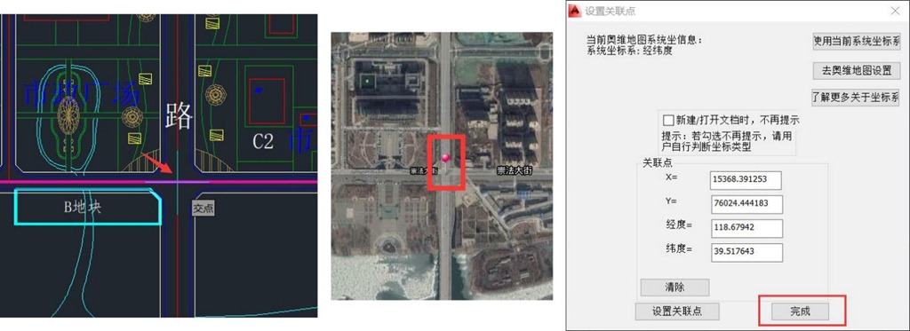 在CAD中選擇一個點作為關(guān)聯(lián)點,然后自動調(diào)轉(zhuǎn)到奧維中,在與之對應(yīng)的位置創(chuàng)建一個標簽,完成后會自動跳轉(zhuǎn)至CAD,將獲取到的XY坐標和經(jīng)緯度坐標填充到對應(yīng)的輸入框中,點擊【完成】,即可設(shè)置好關(guān)聯(lián)點。