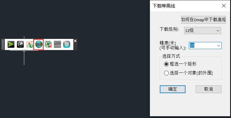 選擇方式:框選一個矩形,即按照用戶框選的矩形區(qū)域下載等高線數(shù)據(jù);選擇一個對象,即以某個對象為中心,下載周邊的等高線數(shù)據(jù)。本文以【框選一個矩形】為例。