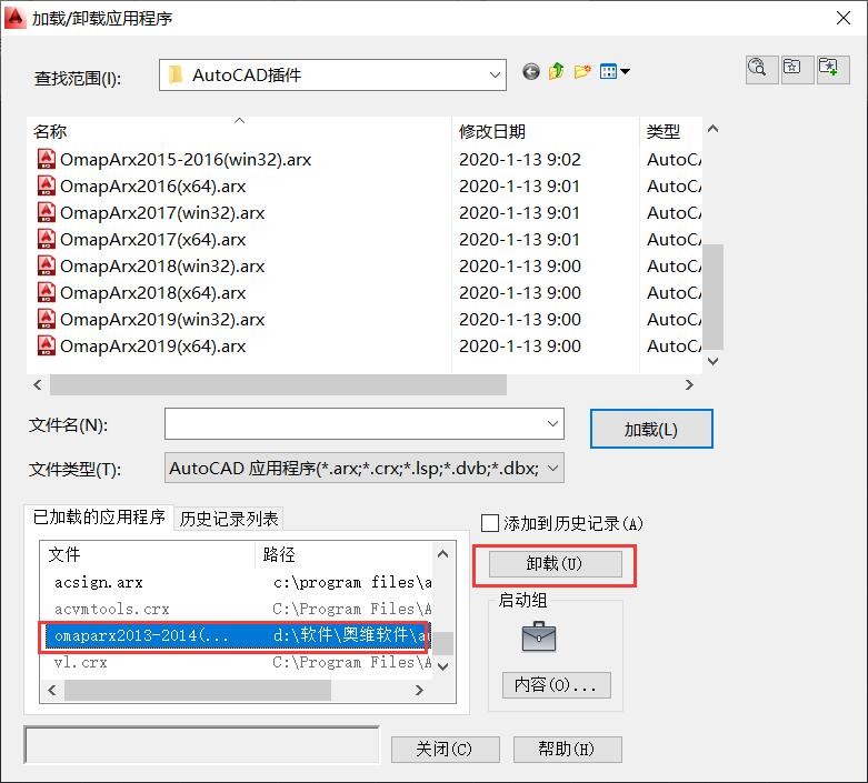 在[加載/卸載應(yīng)用程序]窗口,選中已加載的omaparx,點擊【卸載】,即可。