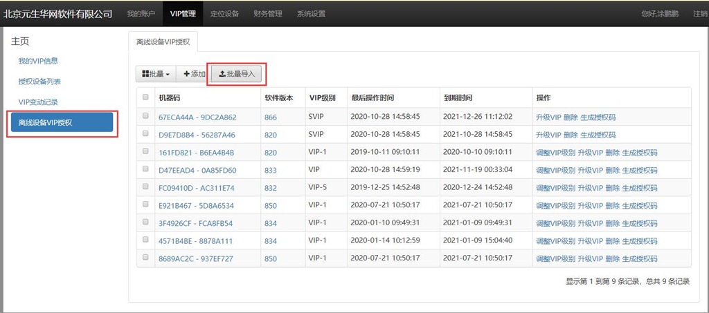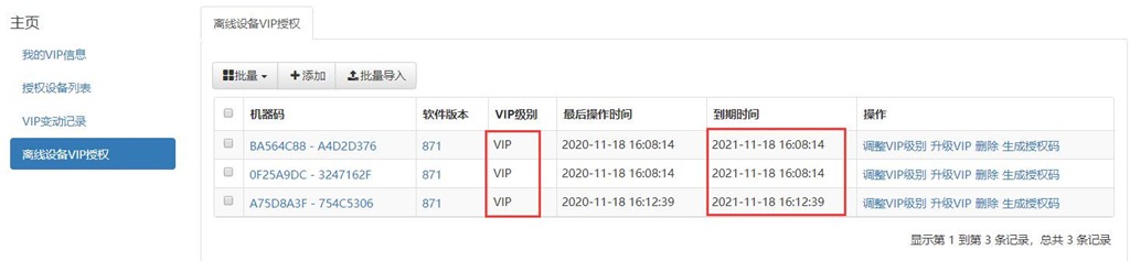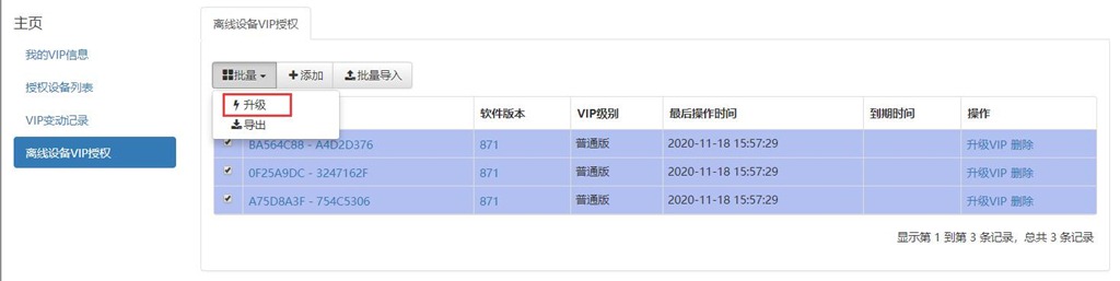 在系統(tǒng)中,點擊【VIP管理】→【離線設備VIP授權】→【批量導入】。