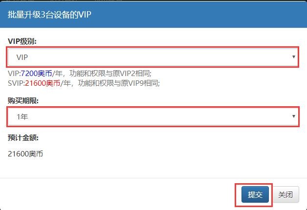 • 如給所有的設備升級到有效期限為1年的VIP,每臺設備需要7200奧維幣;如給所有的設備升級到有效期限為1年的SVIP,每臺設備需要21600奧幣;