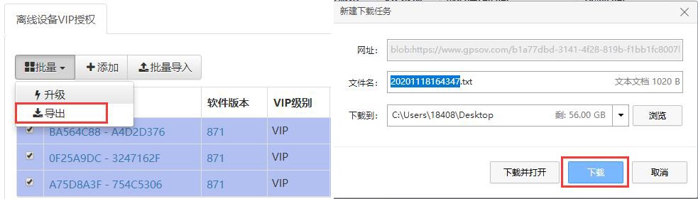 升級完成后,勾選設備,點擊【批量】→【導出】,自動生成txt文件