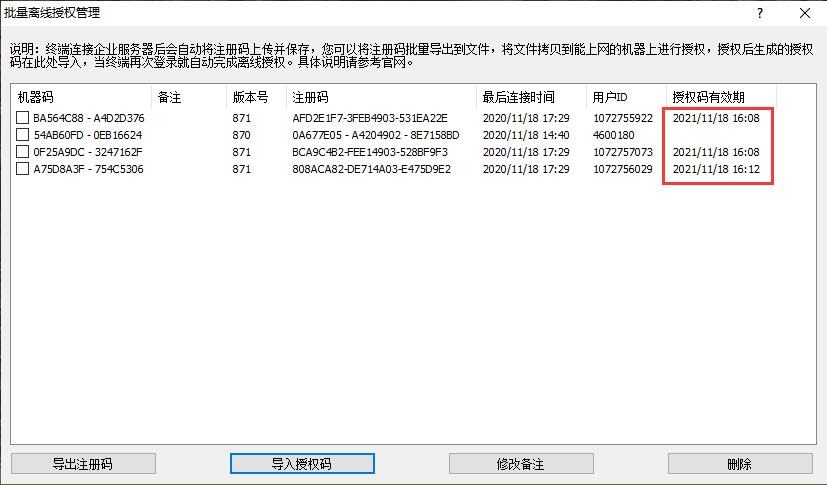 在[批量離線授權管理]窗口中,勾選需要授權的機器,點擊【導出注冊碼】,批量導出需要授權的機器。