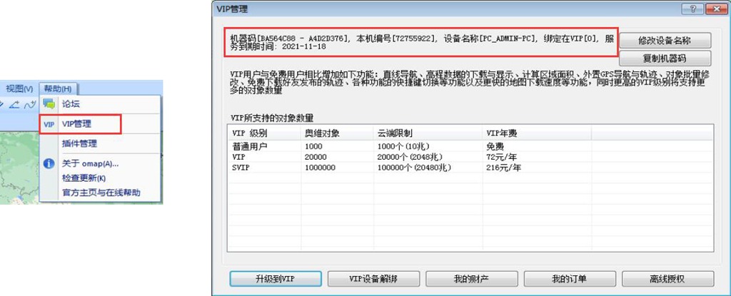在離線電腦的奧維互動地圖中,您可以點擊【幫助】→【VIP管理】查看VIP等級和服務到期時間。