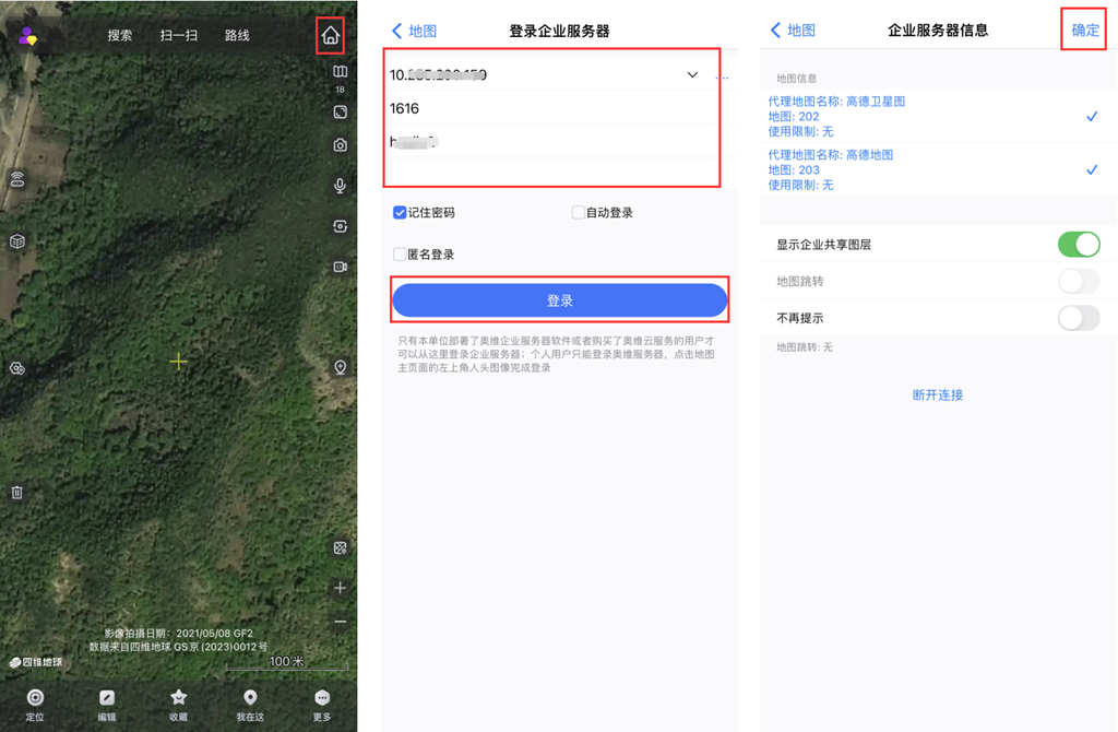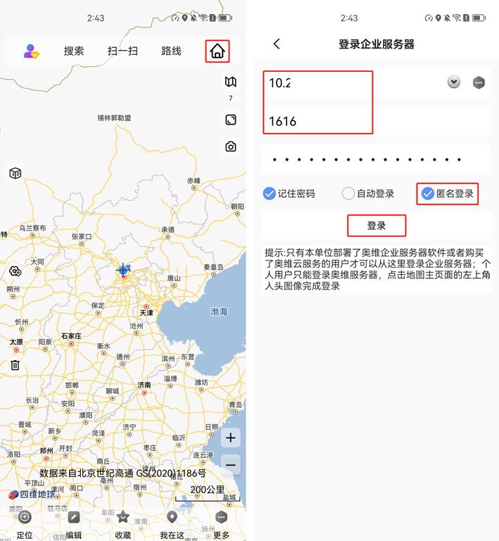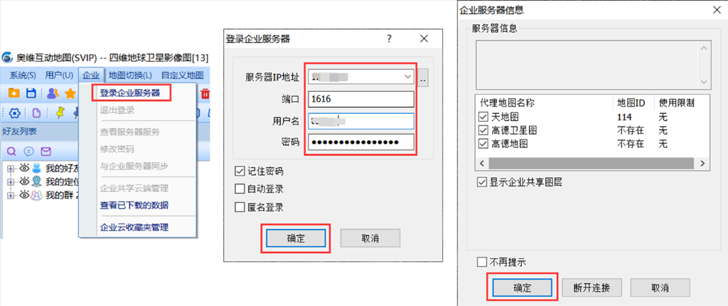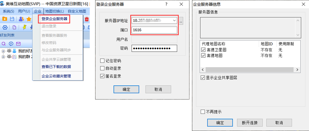 在電腦端的奧維互動地圖中,點擊[企業(yè)]→【登錄企業(yè)服務器】,輸入服務器ip地址、端口號、用戶名和密碼,點擊【登錄】,即可。