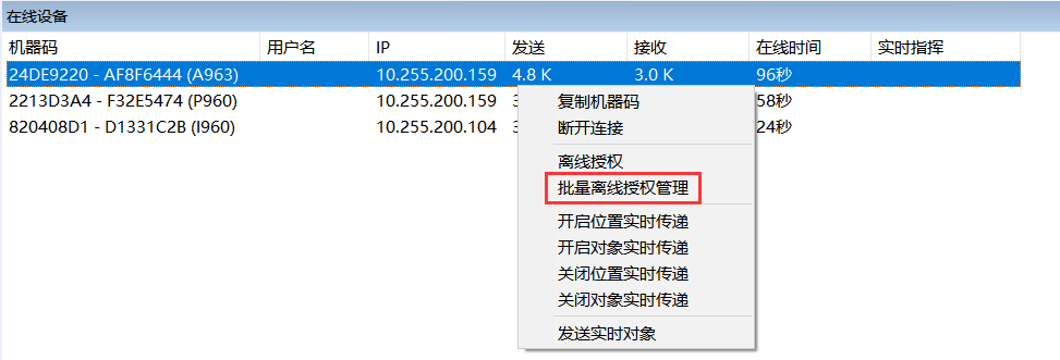 在管理控制臺【在線設備】窗口中,點擊鼠標【右鍵】→【批量離線授權管理】。