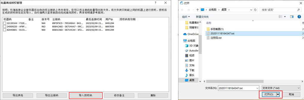在管理控制臺[在線設備]窗口,點擊鼠標右鍵→【批量離線授權管理】→【導入授權碼】,選中授權文件,點擊【打開】按鈕。
