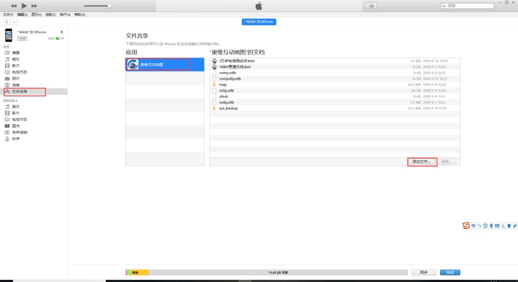而蘋(píng)果用戶則需要通過(guò)iTunes將數(shù)據(jù)放到奧維根目錄下,如下圖所示。連接手機(jī)后,點(diǎn)擊【文件共享】,找到奧維互動(dòng)地圖,將文件添加到奧維互動(dòng)地圖的目錄下即可。