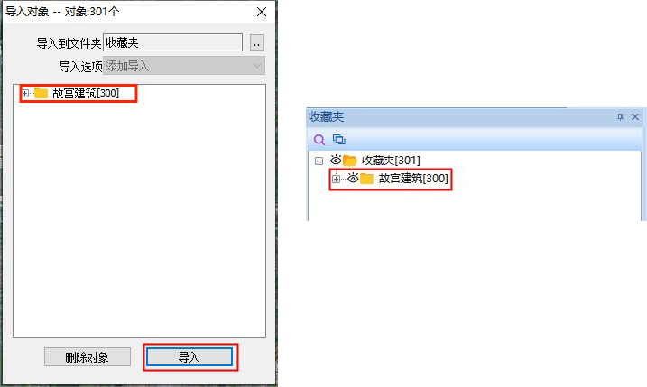 點(diǎn)擊【開(kāi)始解析】按鈕,執(zhí)行解析。解析完成后,彈出[導(dǎo)入對(duì)象]窗口,設(shè)置導(dǎo)入到文件夾,點(diǎn)擊【導(dǎo)入】按鈕,執(zhí)行導(dǎo)入。導(dǎo)入成功后,在收藏夾中會(huì)自動(dòng)生成文件夾,導(dǎo)入的對(duì)象存放于該文件夾中,同時(shí)導(dǎo)入的對(duì)象也會(huì)顯示在地圖窗口中。