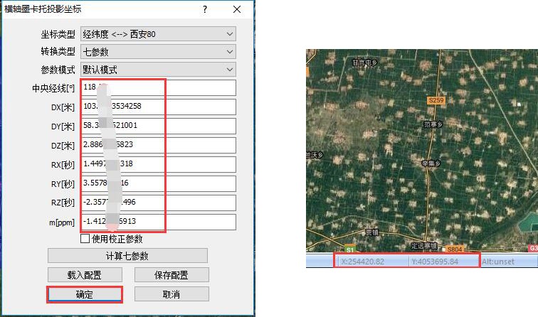 用戶設(shè)置完成中央經(jīng)線和七參數(shù)后,點(diǎn)擊【確定】按鈕,關(guān)閉[橫軸墨卡托投影坐標(biāo)]設(shè)置窗口,點(diǎn)擊【確定】按鈕,系統(tǒng)坐標(biāo)系即顯示為西安80坐標(biāo)。