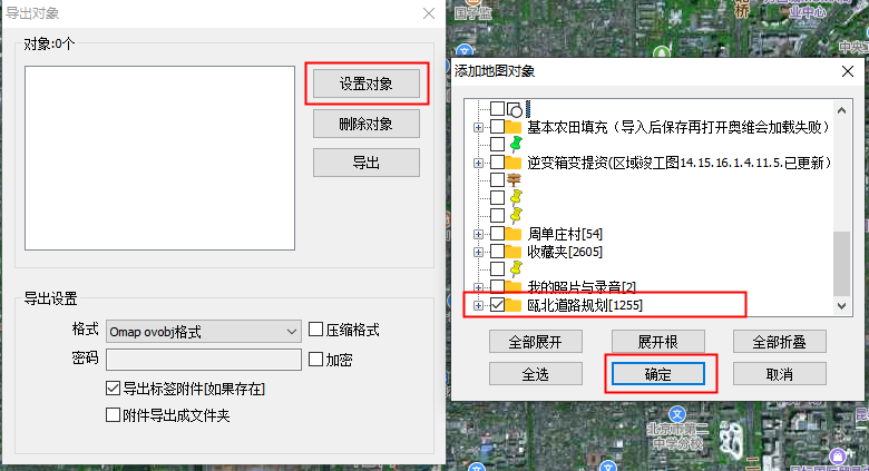 在[導(dǎo)出對(duì)象]窗口中,點(diǎn)擊【設(shè)置對(duì)象】按鈕,彈出[添加地圖對(duì)象]窗口,勾選需要導(dǎo)出的對(duì)象,點(diǎn)擊【確定】按鈕。