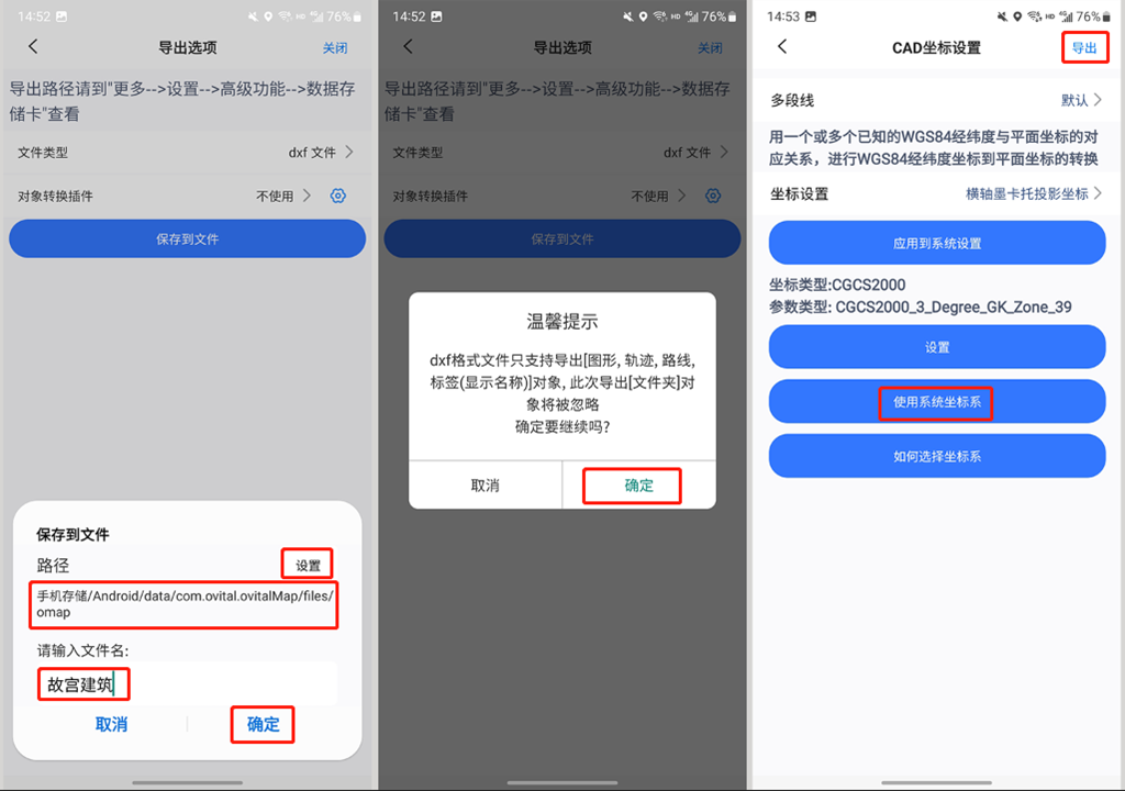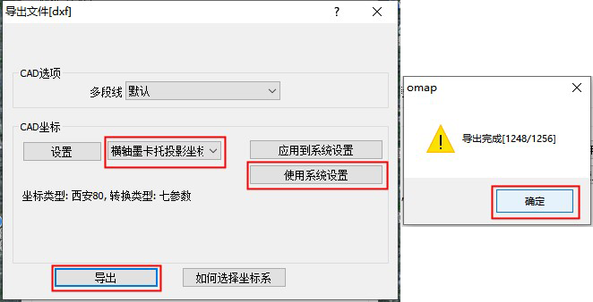 若用戶已將系統(tǒng)坐標(biāo)系設(shè)置為北京54、西安80以及CGCS2000等平面坐標(biāo)系,且需要導(dǎo)出當(dāng)前系統(tǒng)坐標(biāo)系的CAD文件,則點(diǎn)擊【使用系統(tǒng)設(shè)置】即可。