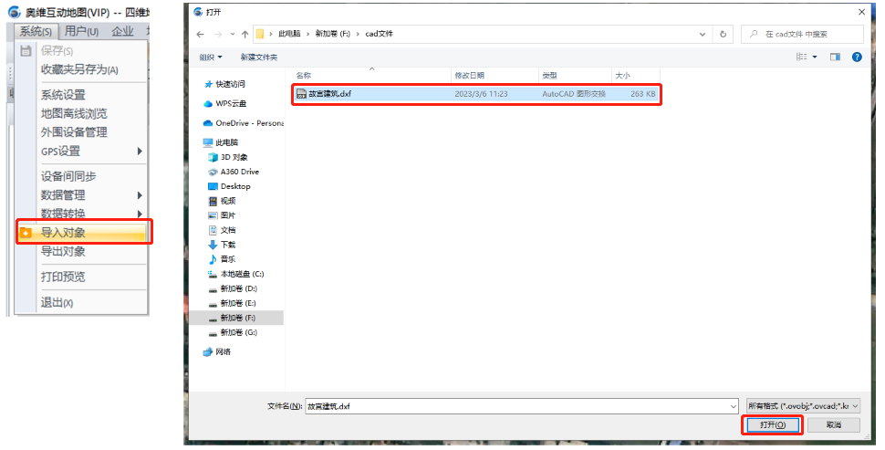 在奧維電腦端,點(diǎn)擊[系統(tǒng)]→【導(dǎo)入對(duì)象】,選擇需要導(dǎo)入的CAD文件,點(diǎn)擊【打開(kāi)】。