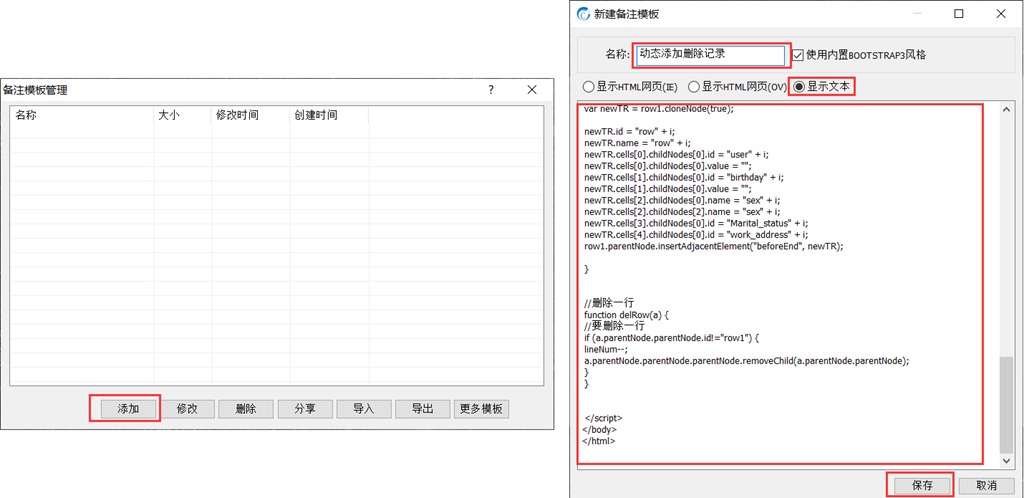 在[備注模板管理]頁面,點(diǎn)擊【添加】按鈕,輸入名稱,點(diǎn)擊【顯示文本】,將代碼復(fù)制到此處,點(diǎn)擊【保存】,即可。