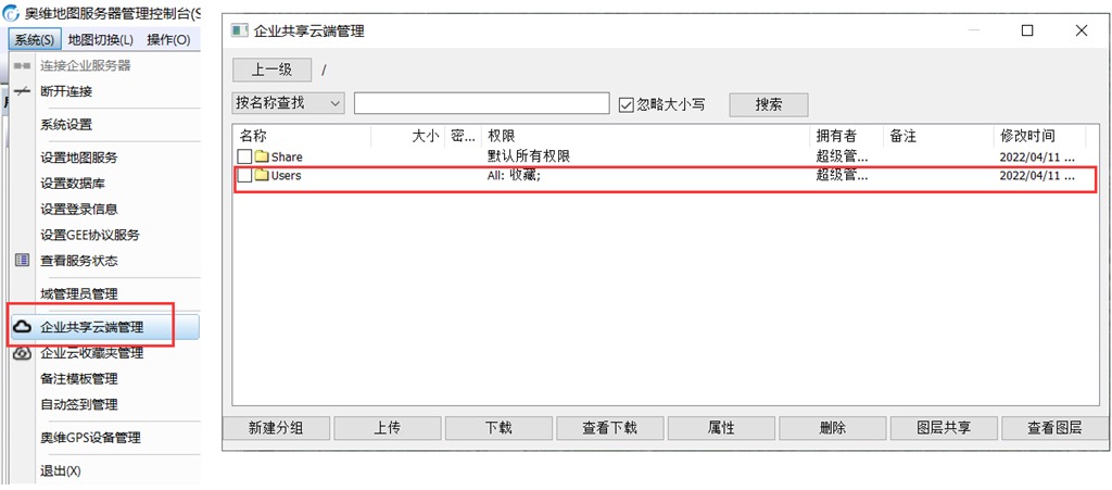 在管理控制臺PC端中,點(diǎn)擊[系統(tǒng)]菜單,點(diǎn)擊【企業(yè)共享云端管理】,這里有兩個(gè)根文件夾,Share和Users,通常將二維碼存放在Users文件夾下。當(dāng)然,用戶也可以創(chuàng)建一個(gè)單獨(dú)的文件夾。