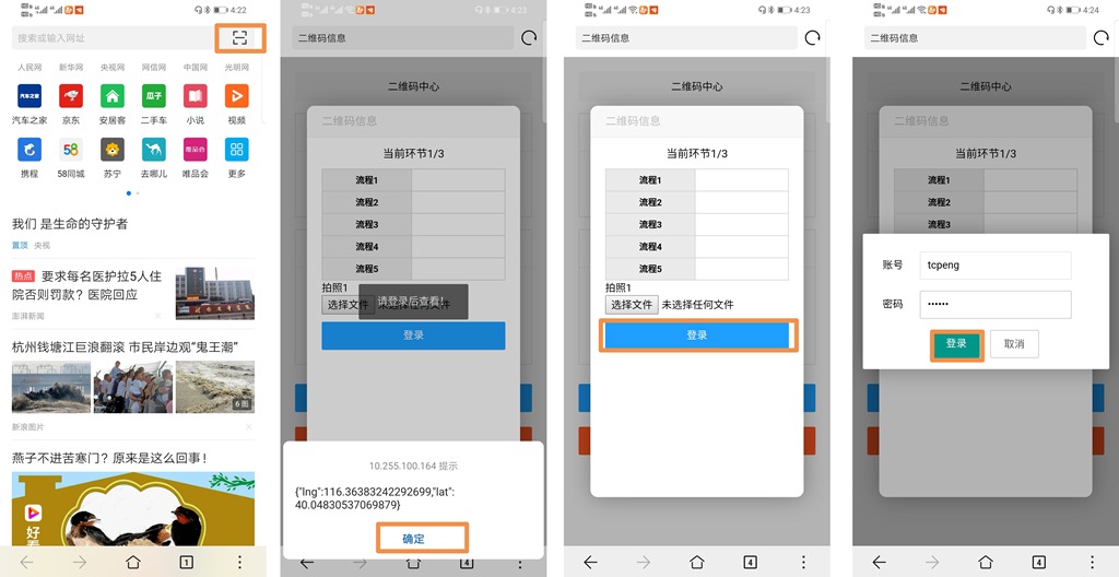 打開手機(jī)自帶的瀏覽器,點(diǎn)擊“掃描二維碼”按鈕,系統(tǒng)會獲取手機(jī)當(dāng)前的位置信息,點(diǎn)擊【確定】。
