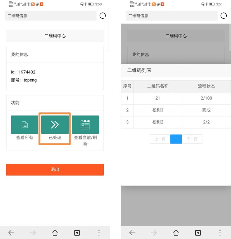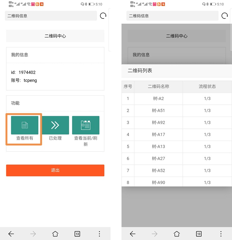 在[二維碼中心]頁面,除了錄入信息外,還可以查看本用戶需要處理的所有二維碼以及已處理的二維碼。