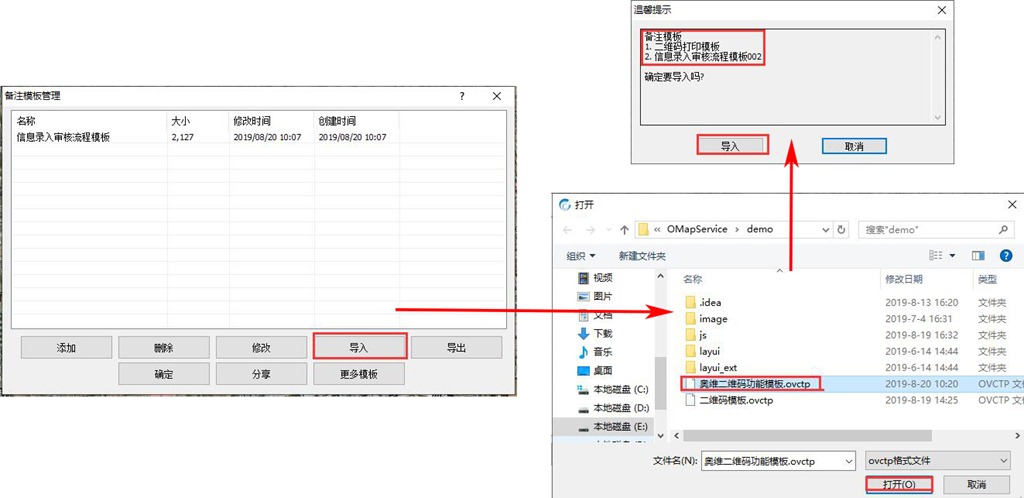 在[備注模板管理]頁面,點(diǎn)擊【導(dǎo)入】,選擇模板文件(.ovctp文件),點(diǎn)擊【打開】,點(diǎn)擊【導(dǎo)入】,即可。該文件中含有二維碼功能需要用到的兩個(gè)模板,如下圖所示。