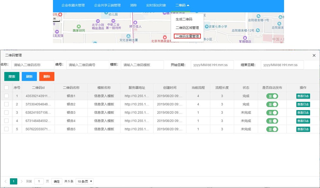 在此,管理員可對所有二維碼進(jìn)行管理,如搜索、刪除、查看日志等。