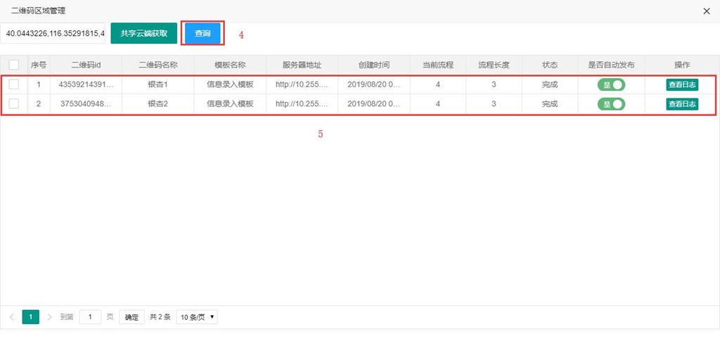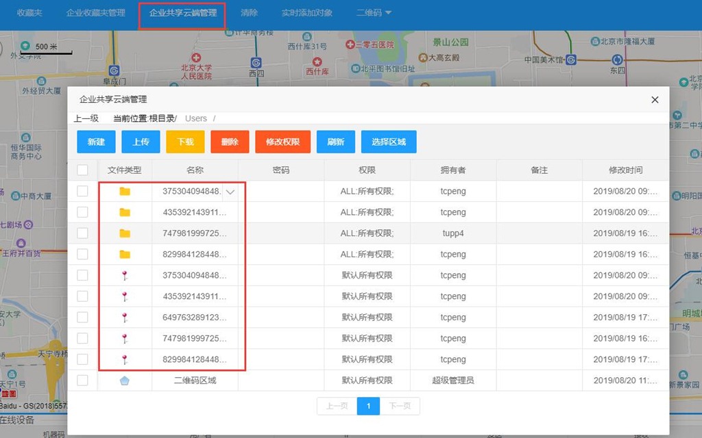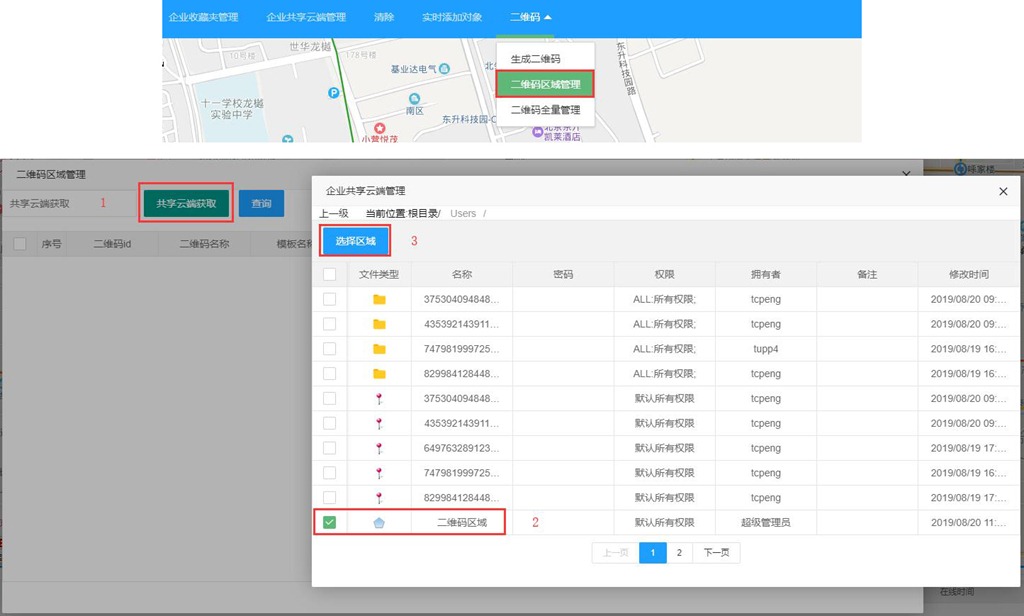 在[二維碼區(qū)域管理]頁面,點(diǎn)擊【共享云端獲取】,彈出[企業(yè)共享云端管理]頁面;進(jìn)入存放區(qū)域的文件夾下,勾選區(qū)域,點(diǎn)擊【選擇區(qū)域】,點(diǎn)擊【查詢】,即可搜索出該區(qū)域內(nèi)的所有二維碼信息。