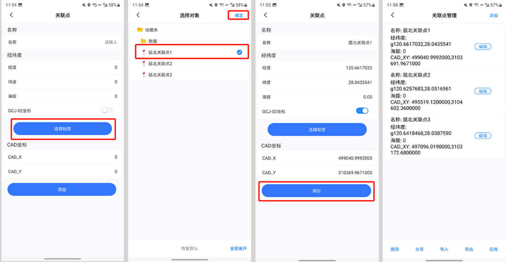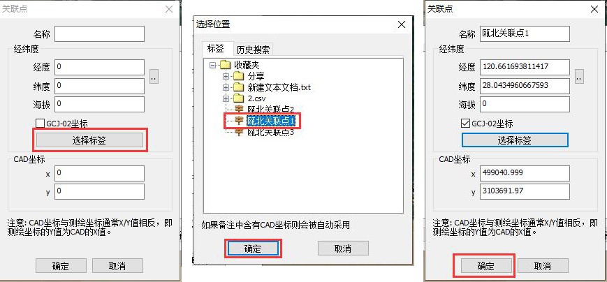 ☆若用戶創(chuàng)建了三個關聯(lián)點標簽,點擊【選擇標簽】按鈕,選擇第一個標簽,點擊【確定】按鈕,系統(tǒng)會自動填入該點的經(jīng)緯度坐標和與之對應的平面坐標,點擊【添加】按鈕,即可添加一個關聯(lián)點。以此類推,添加三個。