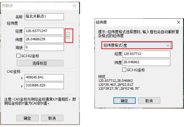 ☆若用戶已有坐標點的經(jīng)緯度坐標和與之對應的平面坐標,直接填寫經(jīng)緯度坐標和CAD坐標。輸入經(jīng)緯度時,可以設置經(jīng)緯度的格式,有“度”“度分”“度分秒”三個格式。另外,若用戶的經(jīng)緯度坐標為GCJ-02坐標(中國GCJ-02經(jīng)緯度),需要勾選【GCJ-02坐標】;如果為CGCS2000地理坐標,那么不需要勾選【GCJ-02坐標】。