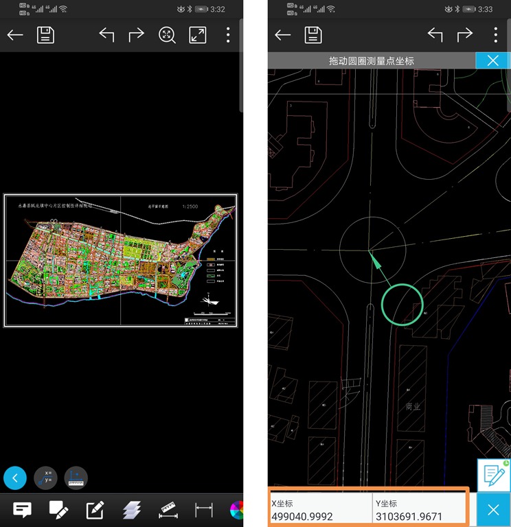在手機上,使用CAD工具打開CAD文件,在圖紙中找到三個特征明顯的點,如交叉路口,地物拐角,這樣便于用戶在地圖上準確的找到具體位置。