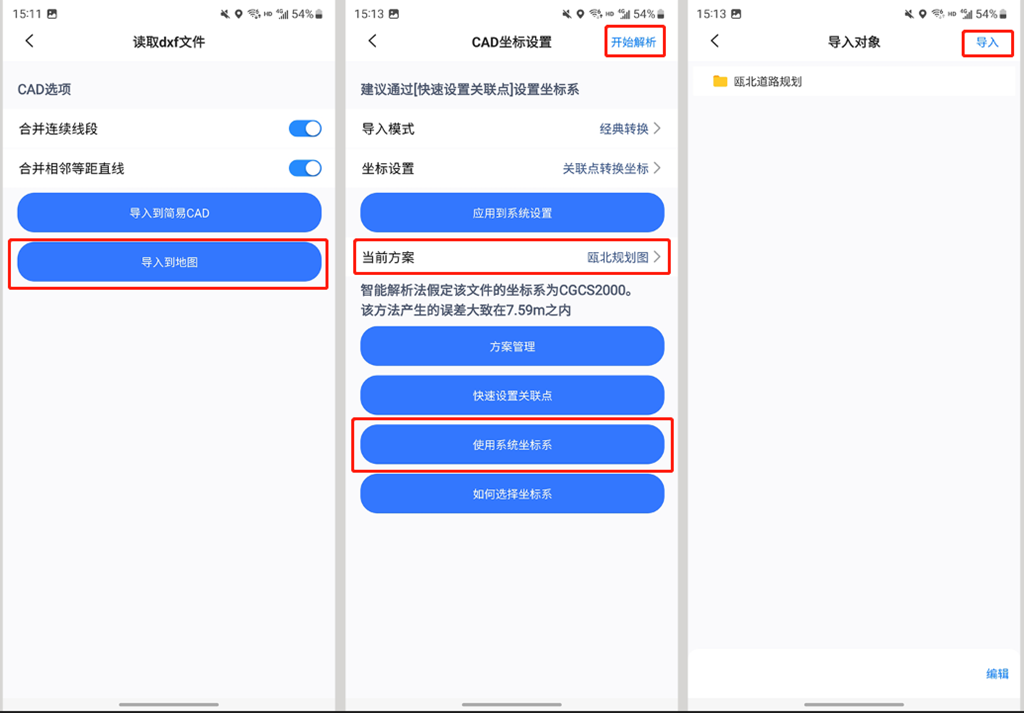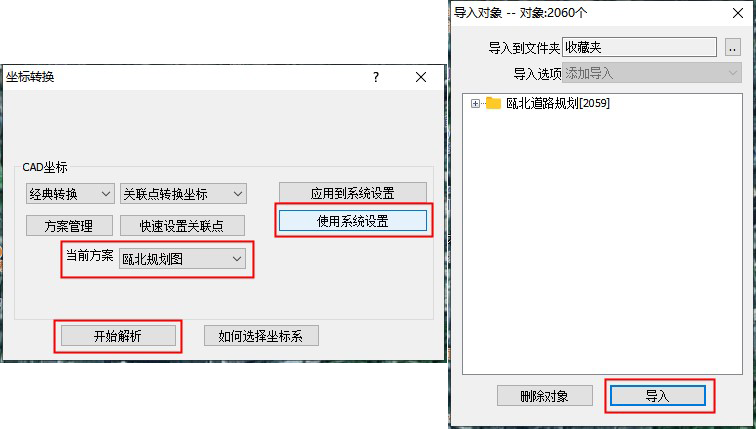 進入[坐標轉換]窗口,由于之前已經(jīng)設置好了系統(tǒng)坐標系,因此這里直接點擊【使用系統(tǒng)設置】,當前方案選擇剛才創(chuàng)建的關聯(lián)點方案。點擊【開始解析】,系統(tǒng)解析文件;點擊【導入】,系統(tǒng)執(zhí)行導入。