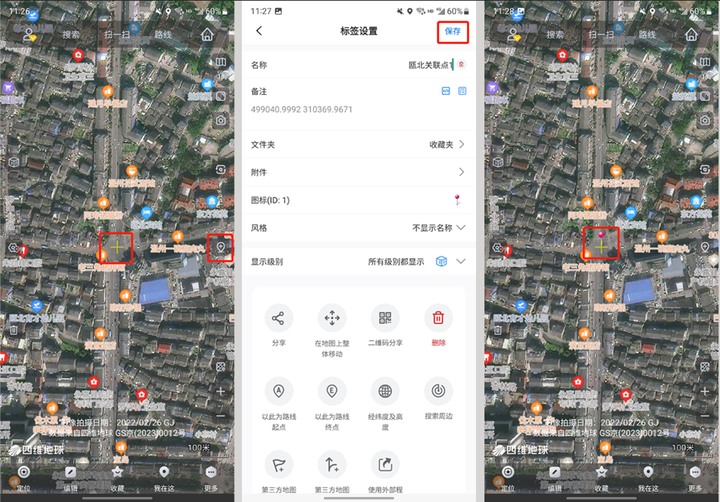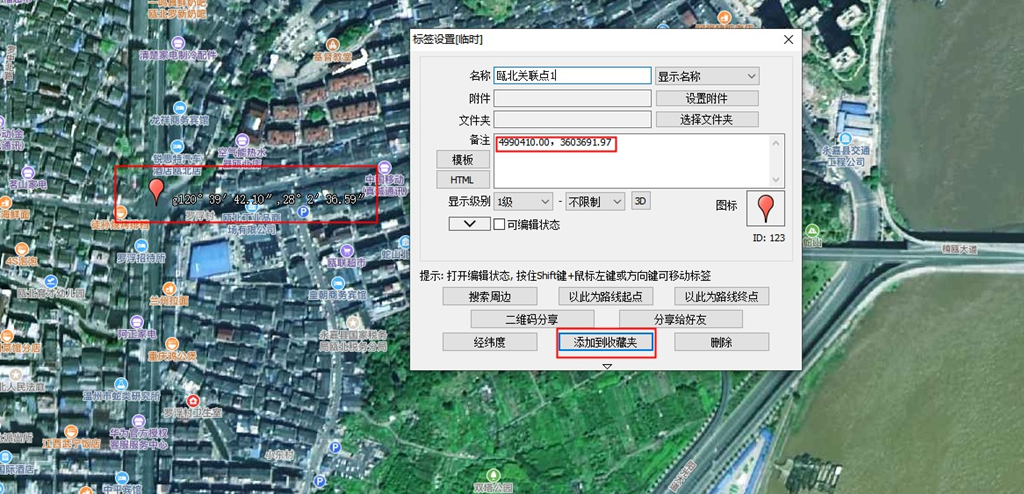 然后在奧維中找到對應的點,在該點處創(chuàng)建標簽,將該點的CAD坐標填寫在備注欄目下面(只需要填寫X和Y,不需要高程),輸入名稱,并點擊【保存】,將標簽保存到收藏夾。