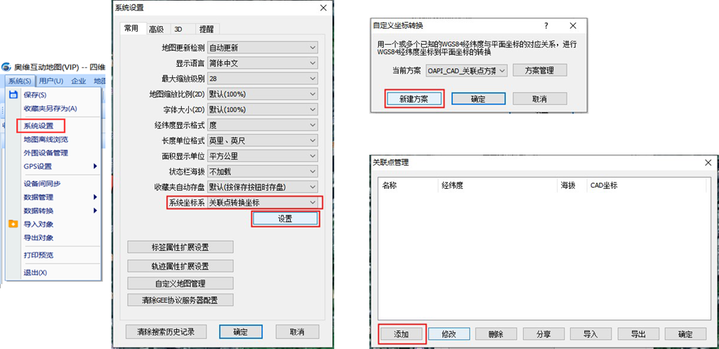 創(chuàng)建完三個關聯(lián)標簽后,點擊[系統(tǒng)]→【系統(tǒng)設置】,點擊【系統(tǒng)坐標系】下拉框,選擇【關聯(lián)點轉換坐標】,點擊【設置】按鈕,進入[自定義坐標轉換]窗口;點擊【新建方案】按鈕,點擊【添加】,進入[關聯(lián)點]窗口。