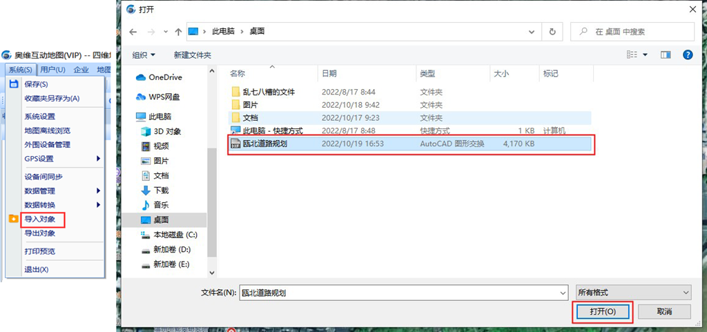 在奧維中,點擊[系統(tǒng)]→【導入對象】,選擇CAD文件,點擊【打開】。