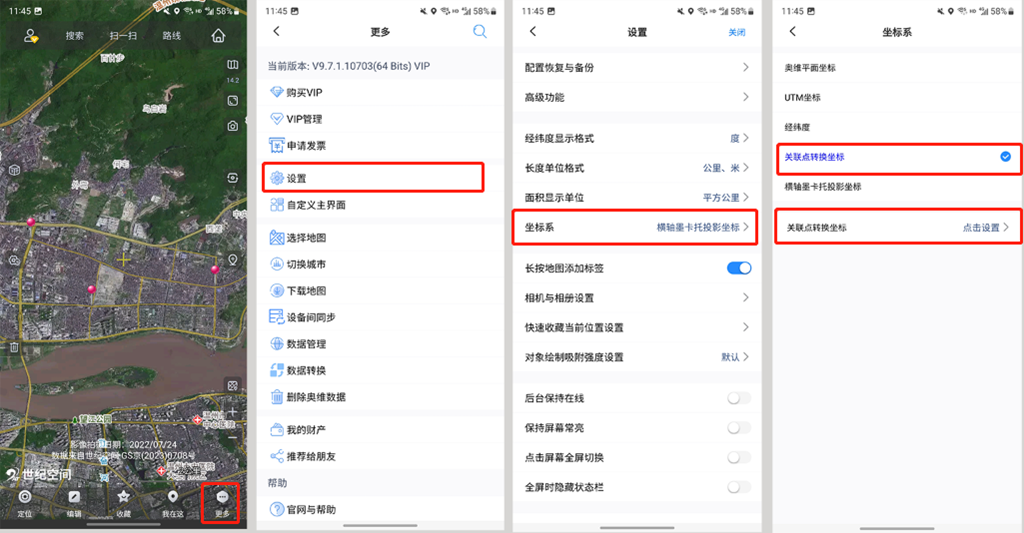 創(chuàng)建完三個關聯(lián)標簽后,在手機端主界面點擊【更多】→【設置】→【坐標系】,選擇【關聯(lián)點轉換坐標】,點擊設置。