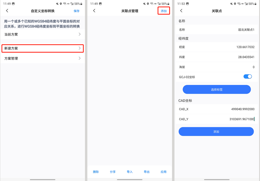 進入[自定義坐標轉換]頁面;點擊【新建方案】按鈕,點擊【添加】,進入[關聯(lián)點]頁面。