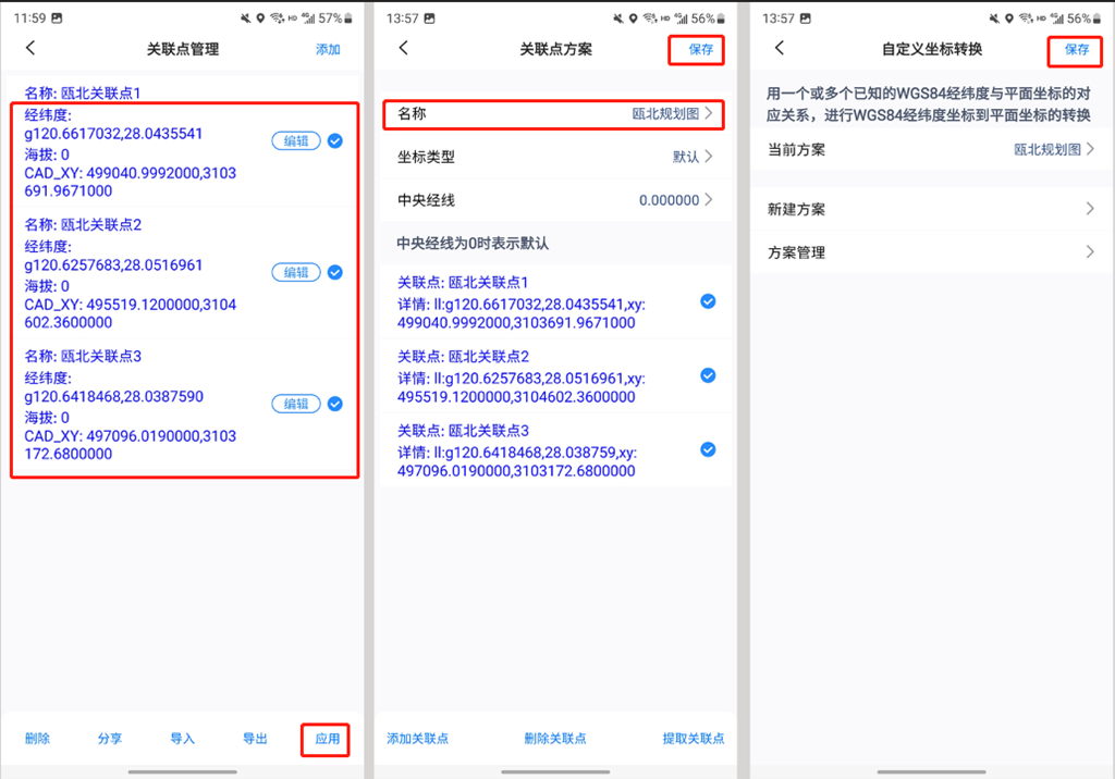 添加三個關聯(lián)點后,勾選,點擊【應用】,輸入名稱,坐標類型和中央經(jīng)線保持默認,點擊【保存】;當前方案選擇剛創(chuàng)建的方案,點擊【保存】,即可完成坐標系的設置。