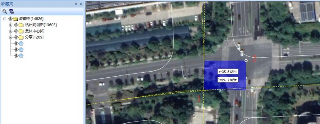 如下圖所示,標識“1”的位置應為道路交叉中心,即實際位置大致為標識“2”所處的位置。通過矩形,可以看到這些數(shù)據(jù)整體向西偏移了35.812米(a),向南偏移了24.778米(b)。