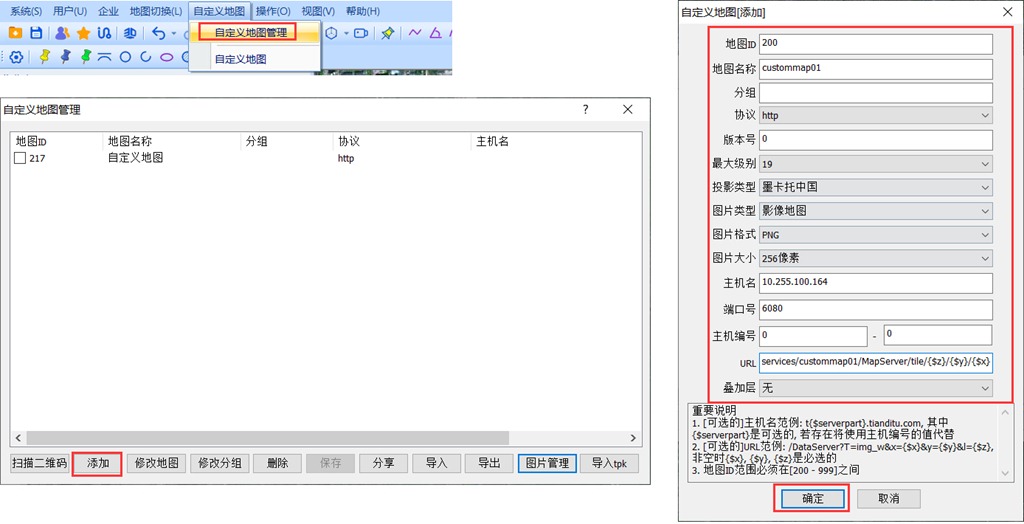 輸入地圖名稱(chēng)、主機(jī)名、端口號(hào)、URL等信息,設(shè)置最大級(jí)別、投影類(lèi)型、圖片類(lèi)型、圖片格式、圖片大小等信息,點(diǎn)擊【確定】按鈕,地圖服務(wù)即添加完成。