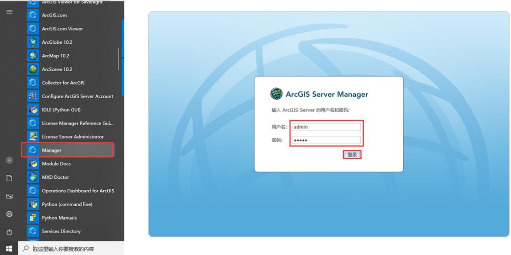 在Windows開(kāi)始菜單,找到ArcGIS目錄,點(diǎn)擊【Manager】,輸入用戶名、密碼,點(diǎn)擊【登錄】。