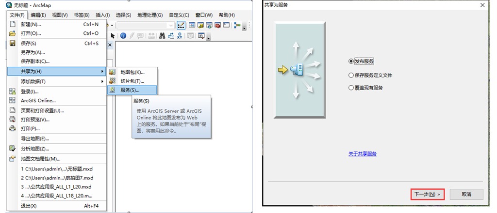 點(diǎn)擊【文件】→【共享為】→【服務(wù)】,選擇【發(fā)布服務(wù)】,點(diǎn)擊【下一步】。