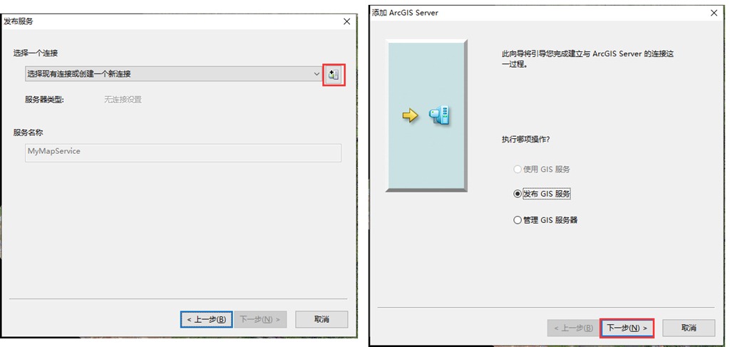 進(jìn)入[發(fā)布服務(wù)]窗口,點(diǎn)擊下拉框右邊的wps7按鈕,進(jìn)入[添加ArcGIS Server]窗口,選擇【發(fā)布GIS服務(wù)】,點(diǎn)擊【下一步】。