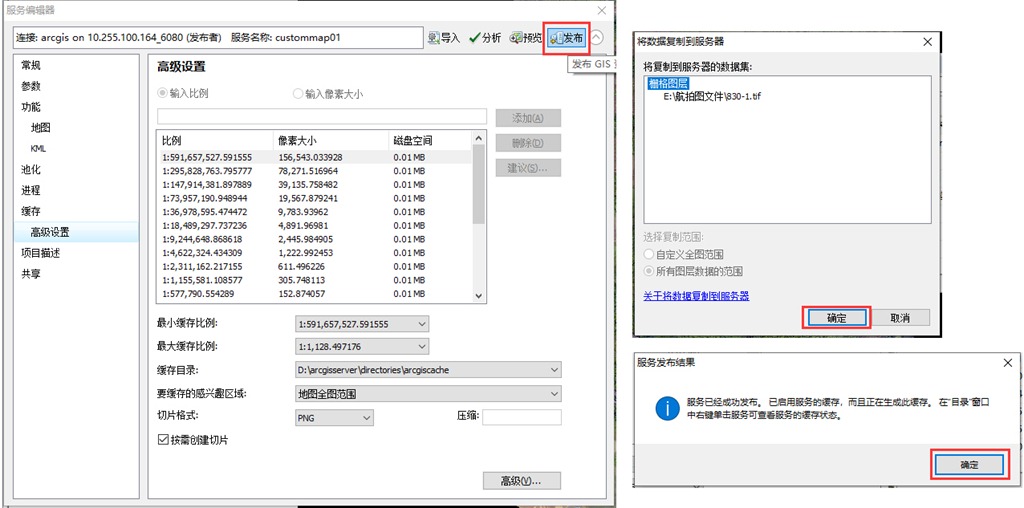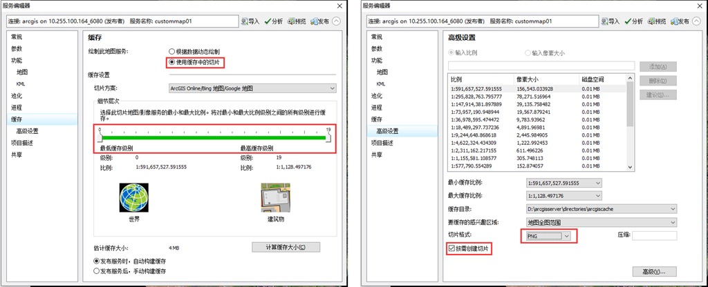 切換到[高級(jí)設(shè)置],設(shè)置最小緩存比例、最大緩存比例、切片格式,勾選【按需創(chuàng)建切片】。