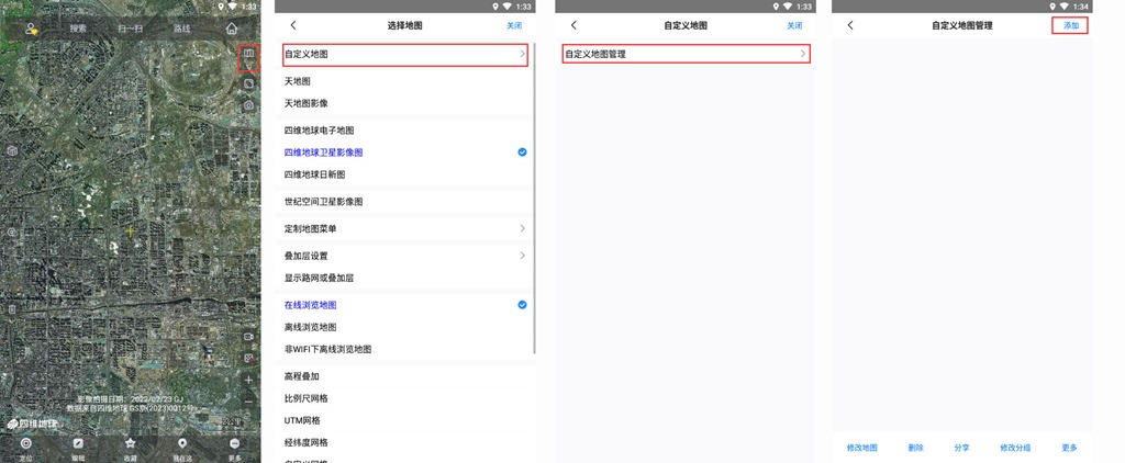 在奧維手機(jī)端主界面,點(diǎn)擊圖片1按鈕,點(diǎn)擊【自定義地圖】→【自定義地圖管理】→【添加】。