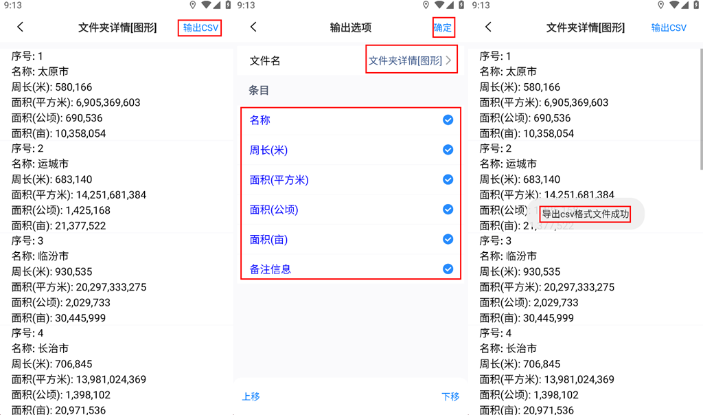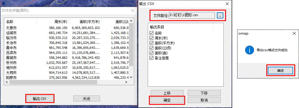 點擊【輸出CSV】,設置文件路徑和輸出條目(勾選需要導出的屬性字段),點擊【確定】,即可導出。
