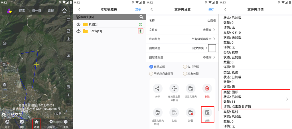 在奧維主界面,點擊【收藏】,進入到[收藏夾];點擊待導出數(shù)據(jù)所在文件夾右側(cè)的wps4按鈕,進入[文件夾設置];點擊【詳情】,點擊圖形條目。