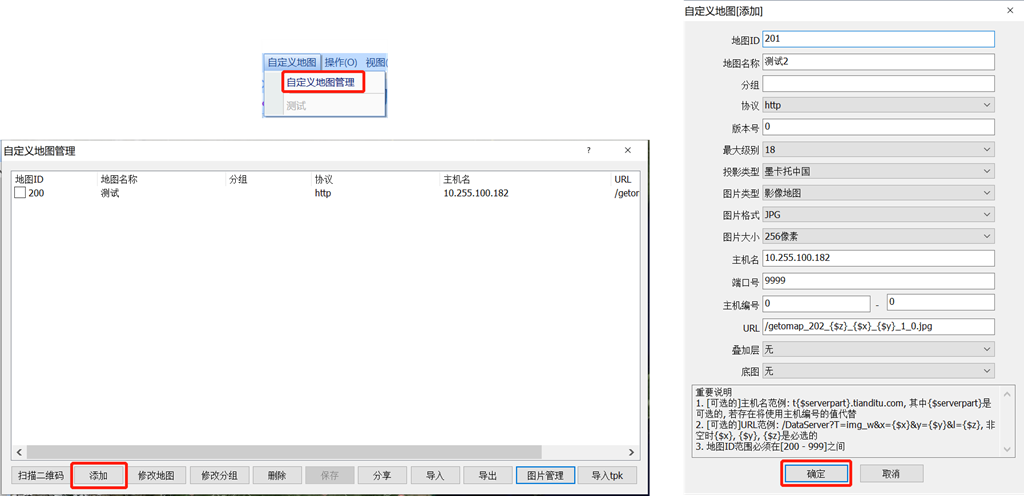 上圖中的地圖是衛(wèi)星圖,如果用戶要疊加路網信息,那么需要在自定義地圖管理中再創(chuàng)建一個路網圖層,獲取路網。