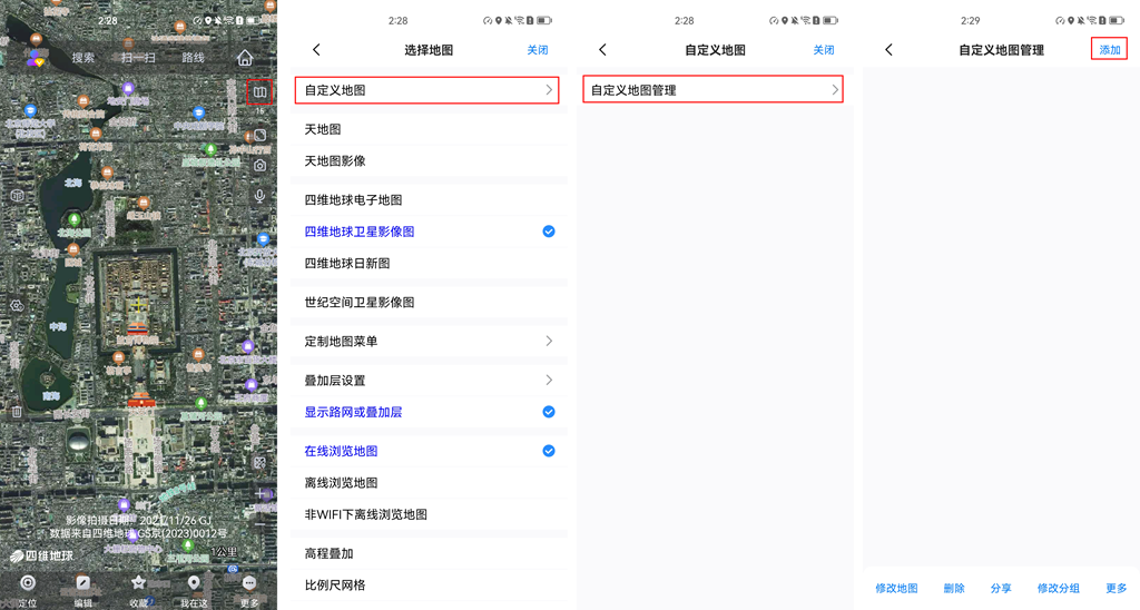在主界面上,點擊【圖層】,點擊【自定義地圖】,點擊【自定義地圖管理】,進入[自定義地圖管理]頁面,點擊【添加】。