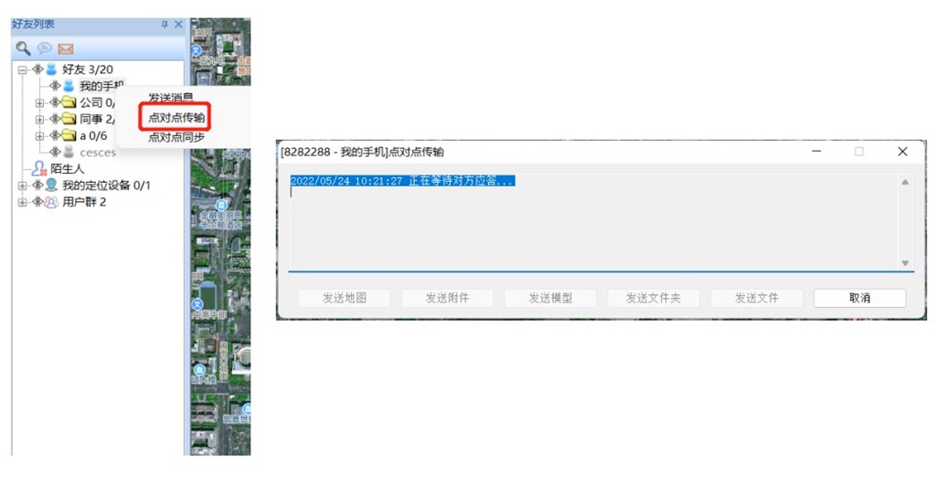 發(fā)送者在電腦端[好友列表]中找到【我的手機】(或?qū)暮糜眩?,鼠標右鍵,選擇【點對點傳輸】。地圖界面會彈出[點對點傳輸]界面。